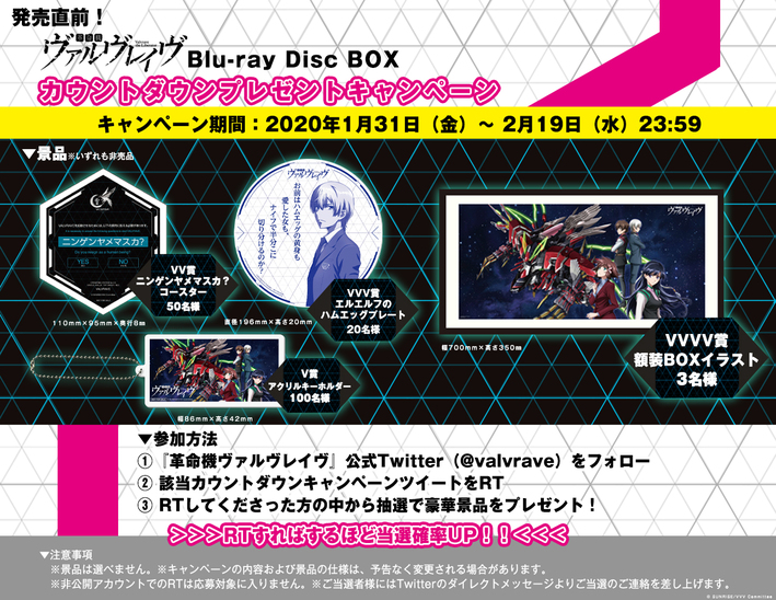 1月31日(金)から『革命機ヴァルヴレイヴ Blu-ray Disc BOX』発売日まで毎日、『革命機械ヴァルヴレイヴ』公式アカウントにてカウントダウンキャンペーンツイートをツイートいたします。